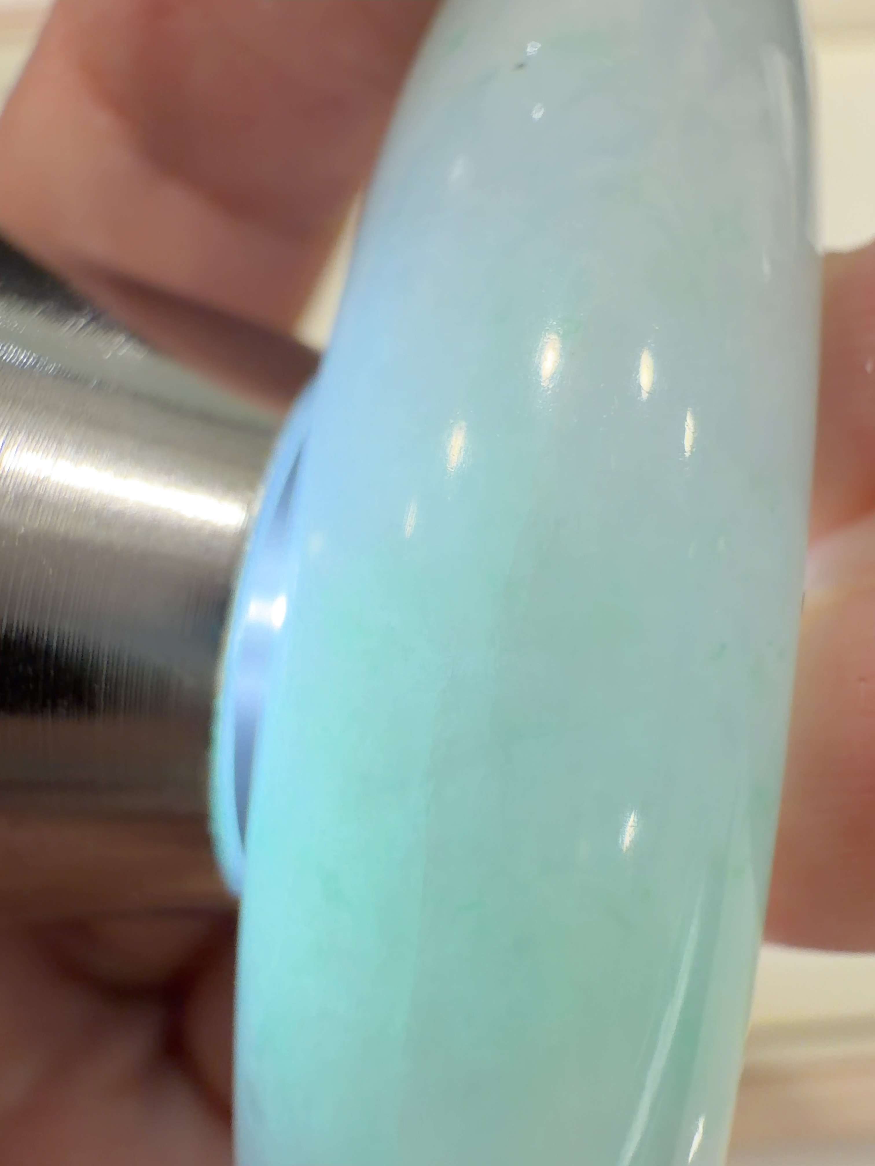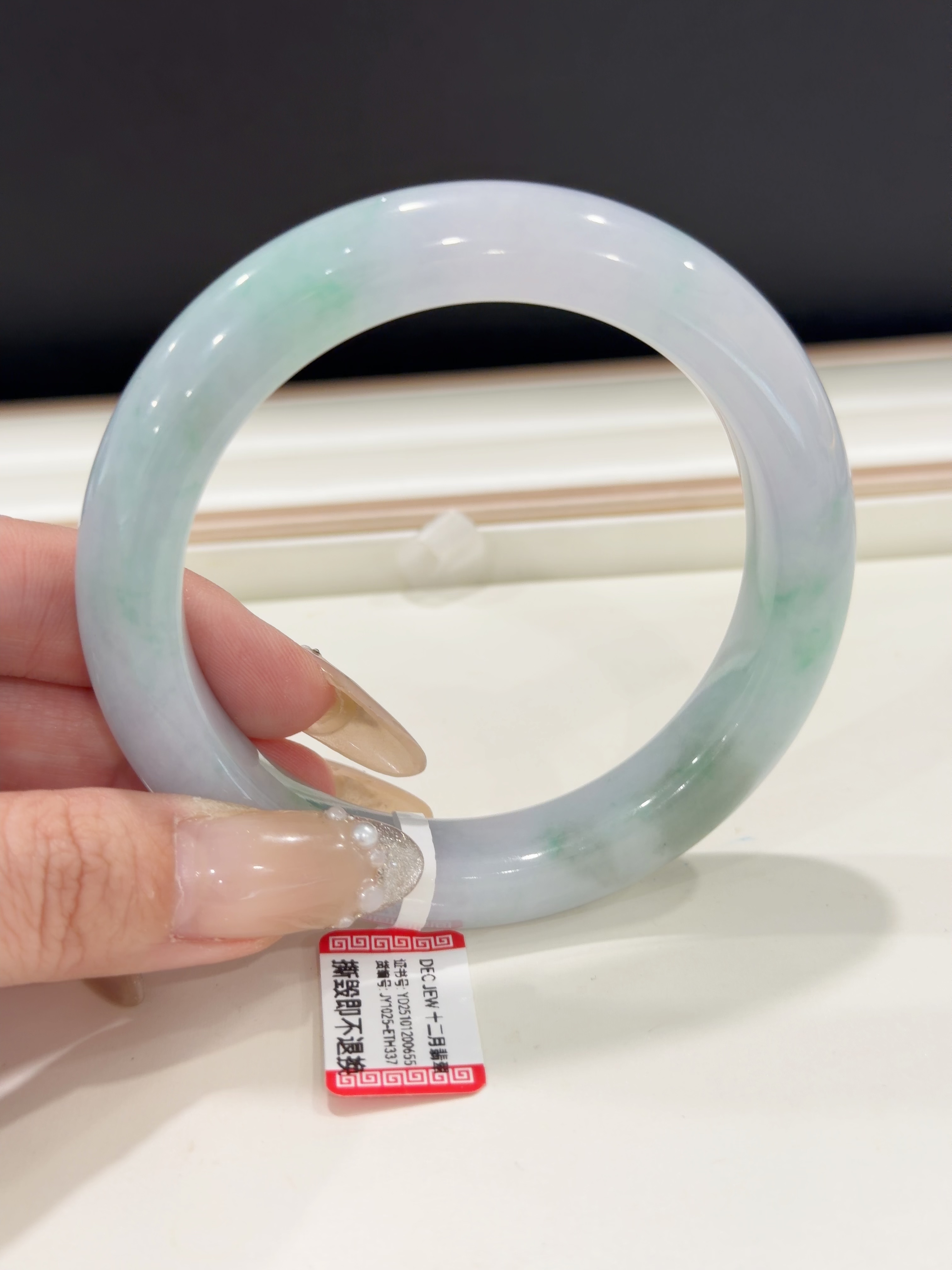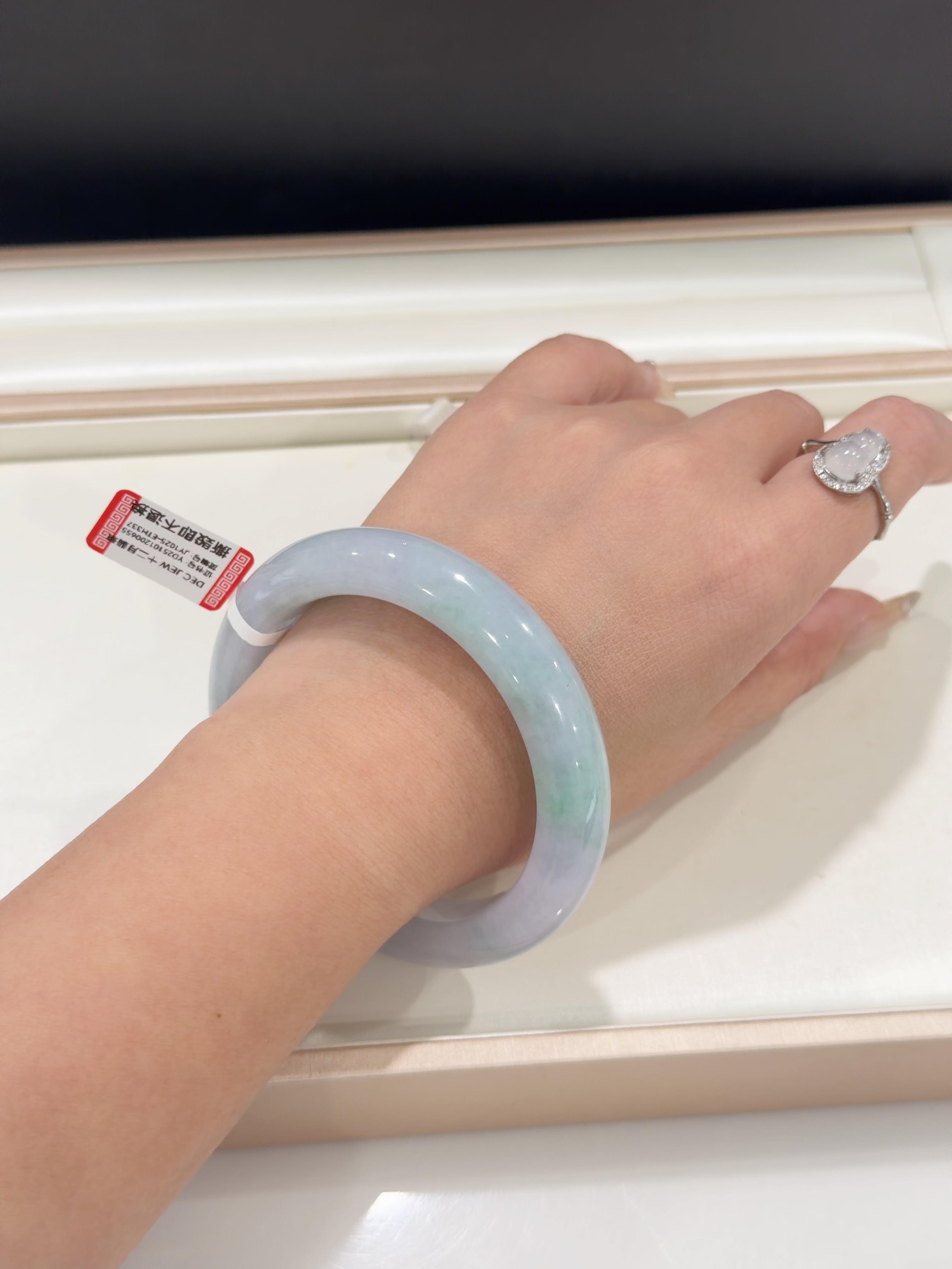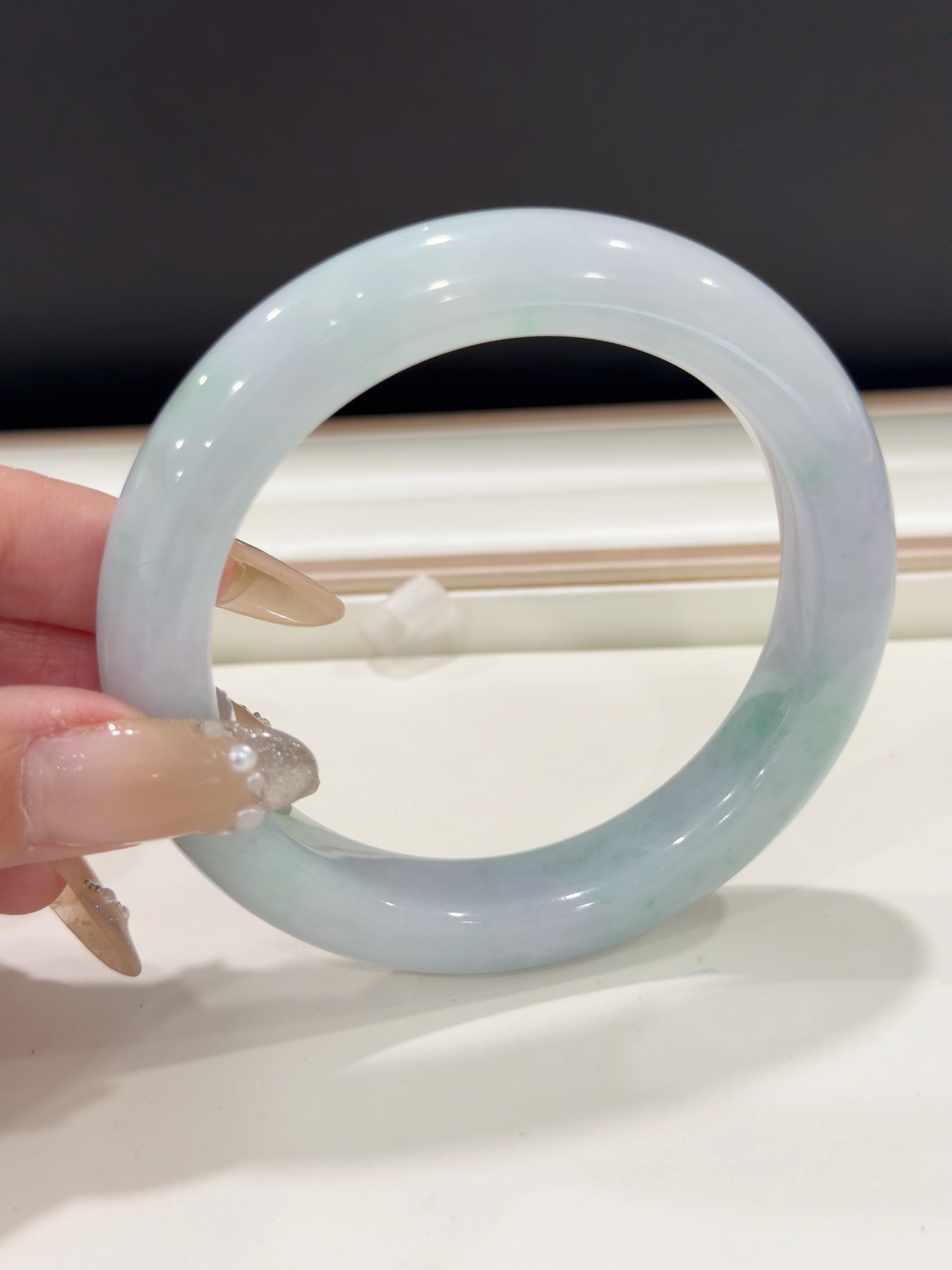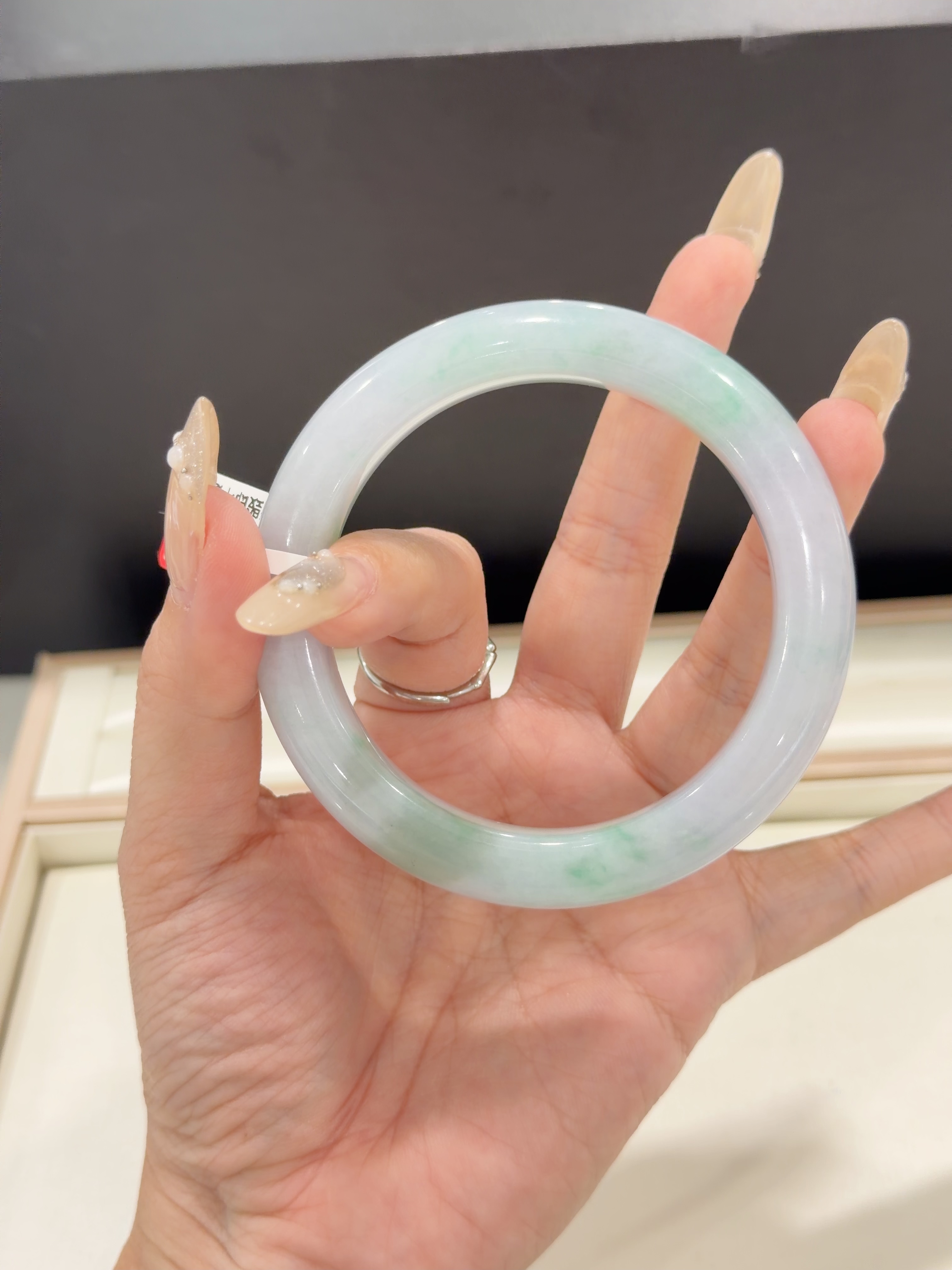 57*12*10mm 正圈 春彩 (56-57圈口合适) 马卡龙色系翡翠春彩,肉质细腻,上手粉嫩,既有少女的姿态,又不失优雅,这有一番韵味。 手镯有条棉线不扣手也不影响牢固,上手不明显
