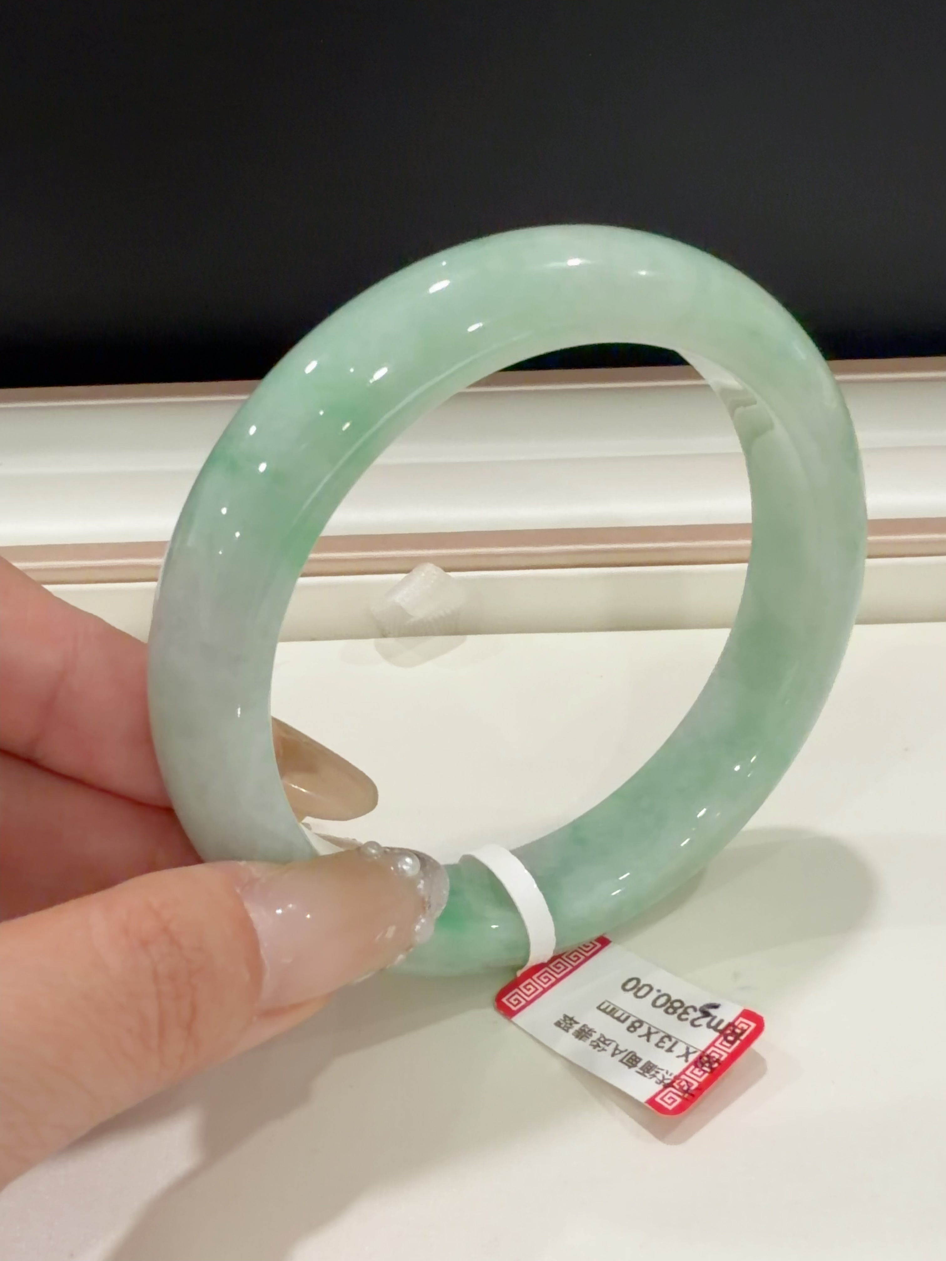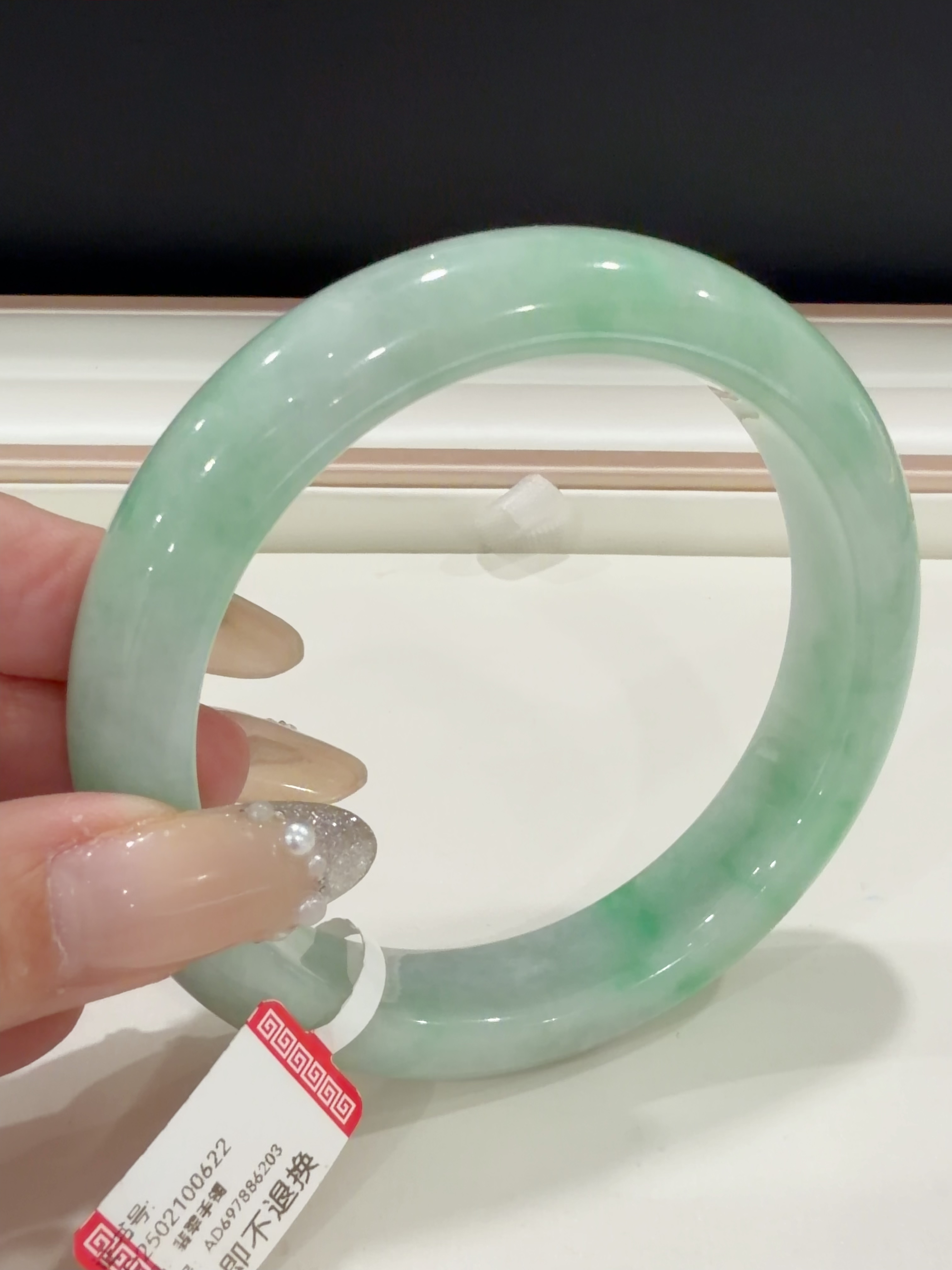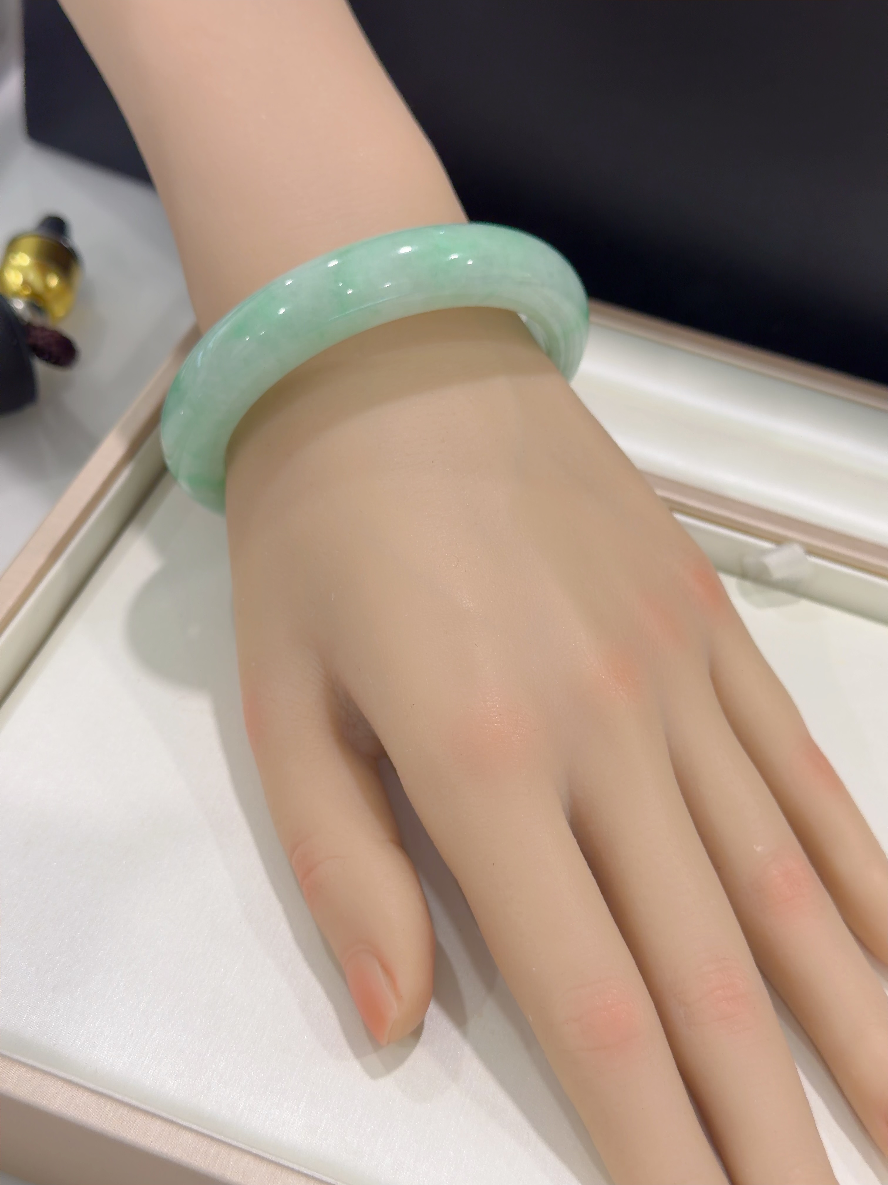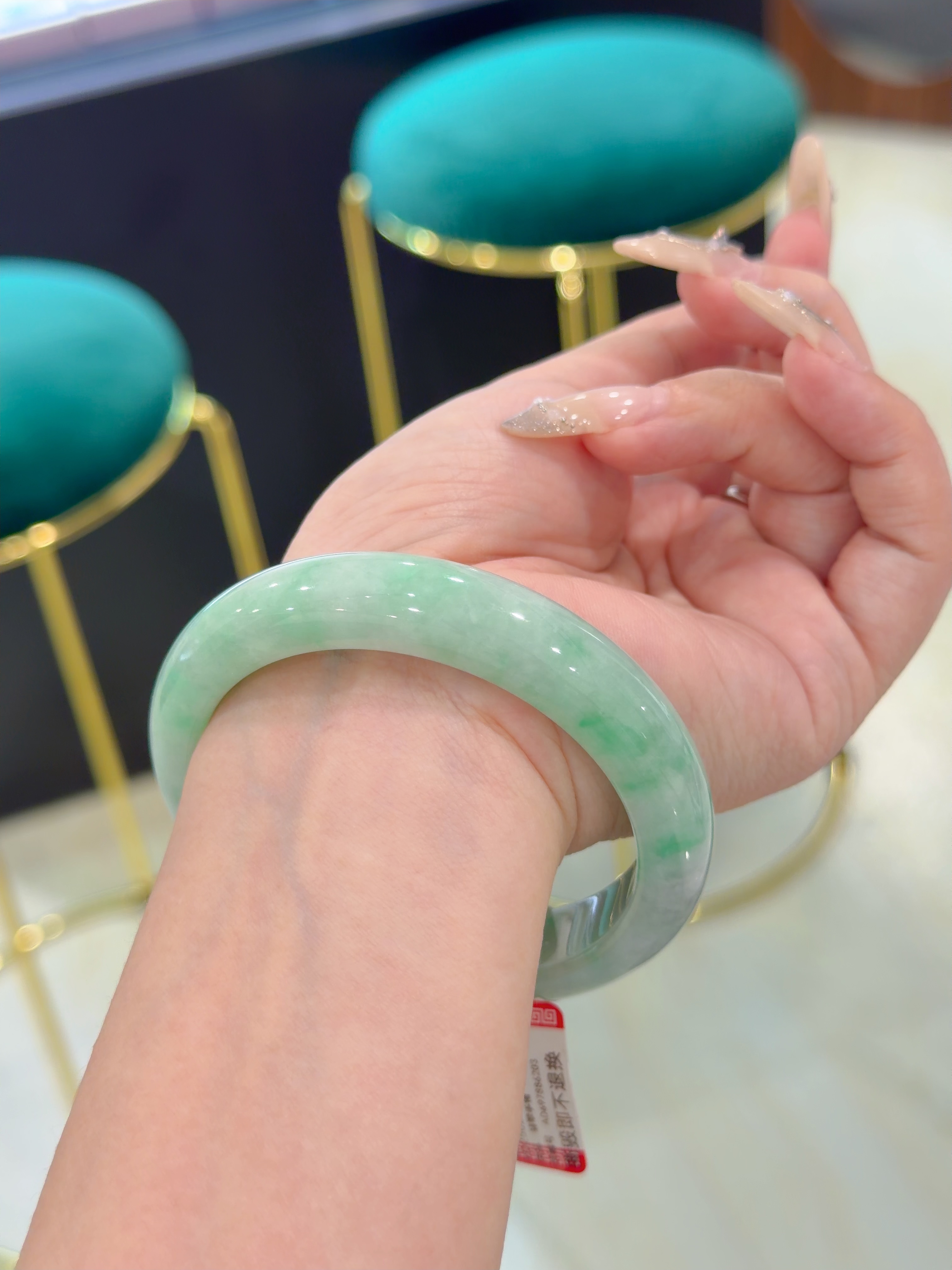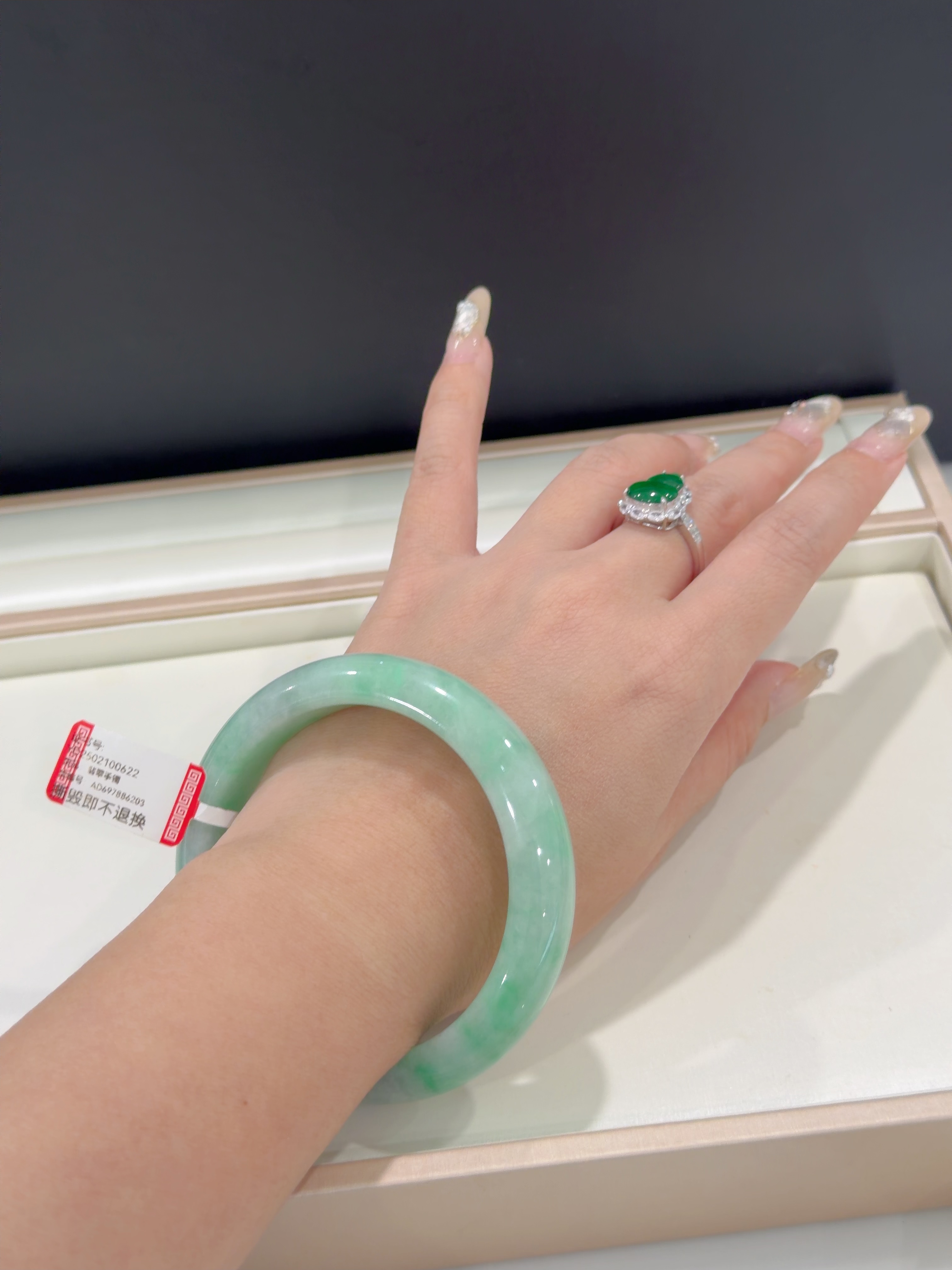 58*13*8mm 正圈 (56-58圈口合适) #58圈口 甜阳绿翡翠手镯 满圈果绿色底,飘几抹阳绿花,带水头足,色度超甜,很清新的糯化底,小千价位性价比超高,上手甜美又显白,朝气满满的一支绿手镯 绿翡翠寓意: 生机与希望 绿色是翡翠的生命之色,也是最能代表翡翠的颜色,它蕴合着无限的生机与健康,平安和希望,像生机勃勃的春天之色。 此外,“绿”谐音“禄”,所以也寓意福禄无边